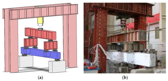 For the calculation of the shear capacity of reinforced concrete (RC) beams, the compilation of the concrete structure design code [1] is mainly based on the test results of ordinary RC beams under direct loading. However, in general cast-in-place concrete structures, the load is not directly loaded on the main beam, but indirectly loaded through the secondary beam or slab, so the loading mode in the actual structure is different from the direct loading mode commonly used in the test, as shown in Figure 1. Therefore, the shear failure mechanism of indirectly-loaded RC beams via secondary beams is obviously different from that of RC direct-loaded beams, causing the shear capacity of the primary beam to be considerably lower [2,3,4,5,6,7,8,9,10,11]. In order to solve this problem of the shear bearing capacity, the structural design of RC beams under indirect loading usually requires additional transverse reinforcement to strengthen the connection between the primary and secondary beams. However, the mechanical properties of concrete and steel will deteriorate to different degrees under fire exposure, thus weakening the bearing capacity of reinforced concrete (RC) members. Therefore, the occurrence of fire will endanger the safety of reinforced concrete (RC) buildings [12,13,14,15,16,17].