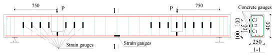 The static load test device of the normal indirect loading specimen was the same as that of the indirect loading beam after fire exposure, as shown in Figure 5. The arrangement of the reinforcement strain measuring points is shown in Figure 6. The vertical deformation of the test beam was measured by LVDTs, and the arrangement of LVDTs was consistent with that of the indirectly loaded beam under thermomechanical coupling, as shown in Figure 4a.