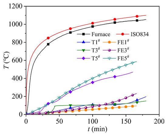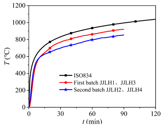 Because of the limitations of furnace equipment on fire tests, it is impossible to provide strict temperature control according to the ISO834 temperature curve [19], as shown in Figure 7. The measured furnace temperatures were basically lower than the temperature specified by the ISO834 temperature curve, but generally matched the geometry of the ISO834 in other aspects. These temperature differences with the other batch could be caused by the reuse of the furnace system or the compactness of the cover slabs.