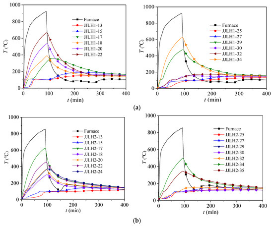 The measured temperatures in the cross-section of the beams during the fire tests are shown in Figure 8. As the experimental results of the indirectly loaded beams have been detailed in the reference [12], this paper only provides a brief introduction of representative beams JJLH1−JJLH2. The following could be observed: