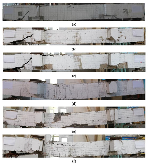 Crack patterns at failure: (a) CWJJL1, (b) JJLH1, (c) JJLH2, (d) CWJJL2, (e) JJLH3, and (f) JJLH4.