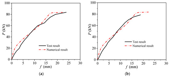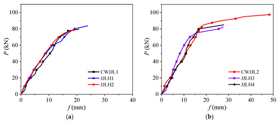 The load P−vertical displacement f curves of the beams under indirect loading are shown in Figure 10. The following conclusions can be obtained: