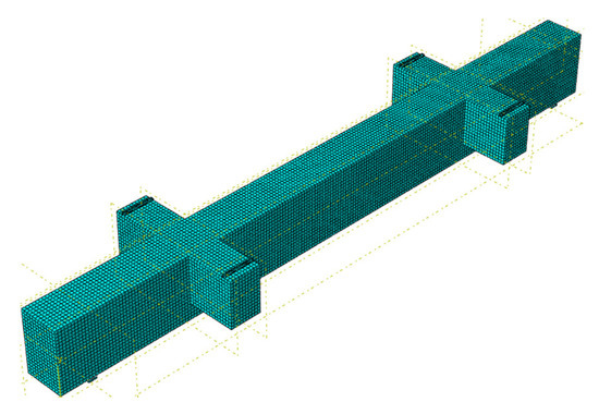 For the beam’s surfaces subjected to fire, the convective heat transfer coefficient was assumed to be a constant of 25 W/(m·K) and the thermal emissivity was recommended to be 0.7. For the no-fire surface, the convective heat transfer coefficient was assumed to be a constant of 9 W/(m·K). For the whole model, the Stefan−Boltzmann constant was assumed to be 5.67 × 10−8 W·m−2·°C−4 [20]. Dense grids were used for the entire model to improve the calculation accuracy. The concrete unit size was 20 mm and the reinforcement unit size was 35 mm.