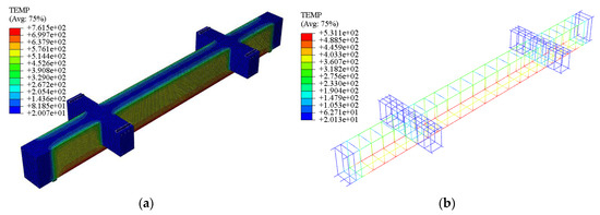 The temperature field distribution of beam JJLH1: (a) concrete and (b) steel.