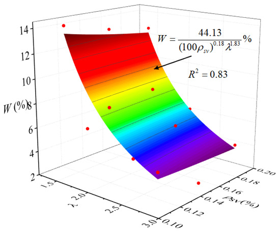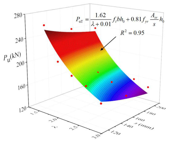 Combined with the simulation results in Table 3, the relationship between the shear bearing capacity of the directly loaded beam after fire exposure for 90 min and parameters such as shear span-to-depth ratio λ and stirrup spacing s are shown in Figure 18. The equation is expressed as follows: