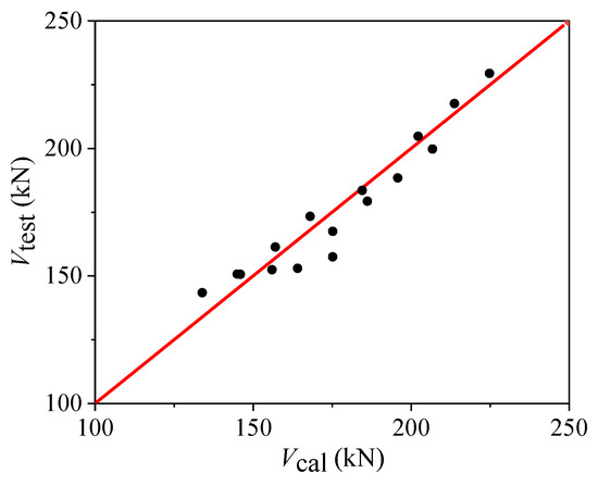 Combined with the experimental results and FE analysis, Equation (3) is used to calculate the shear capacity of the indirectly loaded beams. The theoretical calculation results Vcal of the indirectly loaded beam after fire were compared with the test results Vtest, as shown in Table 4 and Figure 19.