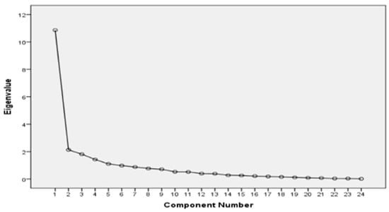The total variance is explained in Table 4 with much emphasis on extraction sums of squared loadings as well as rotation sums of squared loadings. Per the Kaiser criterion, eigenvalues equal to or greater than one (1) in Principal Component Analysis ought to be retained. The significance of a variable is determined by the skewness of its eigenvalue towards 1.00. Based on the eigenvalues, four factors were generated, encapsulating the 24 variables. In total, 67.7% was the total variance explained by all the extracted components. The Cumulative Proportion of Variance Criterion stipulates that the components extracted should explain at least 50% of the variation in the data set. The test result of 67.7% agrees with the above statement (see Table 4). Using the factor loading of 0.50 as the cut-off point, four (4) components with eigenvalues more than 1.0 were extracted. This is indicated on the scree plot in Figure 1.