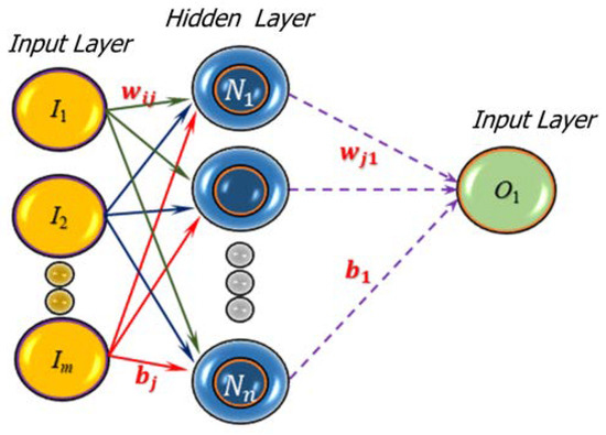 An ANN can be used as a black-box model to connect complicated input and output datasets once it has been properly trained. More influential parameters in ANN weights and biases can help to connect the neurons together, as shown in Figure 1. wij presents the weights of neuron connection between the input node and neuron in the hidden layers. bj denotes the bias associated with the jth neuron in the hidden layer.
