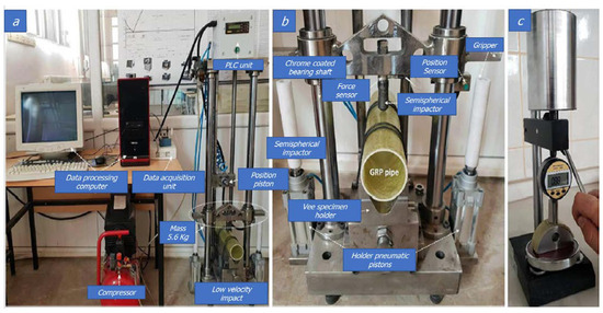 The low-velocity impact responses of GFRP composite pipe samples were investigated using a specially developed low-velocity impact apparatus. In Figure 2, we can see the low-velocity impact instrument, specimen support, and anti-rebound system. V-shaped support with a 60° angle was used to fix the test specimens. We can obtain a single hit since the test stand contains an anti-rebound mechanism. A data logging system is also included in the test stand, which can send force signals at a sampling rate of 25 kHz.