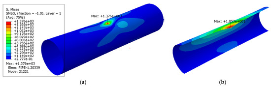 The obtained results based on experimental analysis are compared with developed FEA. The failure initiation was identified, and the damage was simulated using 3D Hashin failure criteria [41,42,43]. This criterion was applied in many studies and offered a more effective result in the damage evaluation in composite constructions. In the current study, this criterion is applied in all steps of the composite pipe’s progressive damage. A suitable grid size is chosen, and the numerical solution’s convergence with the elastic phase is confirmed. Using the S4R mesh type, we reduce the element size from 5 mm to 1 mm, as shown in Figure 5a,b: