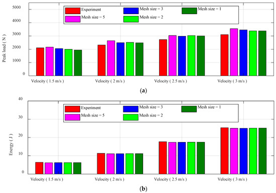 Different numerical outputs for different impact velocities and mesh size: (a) Peak load (N) and (b) energy (J).