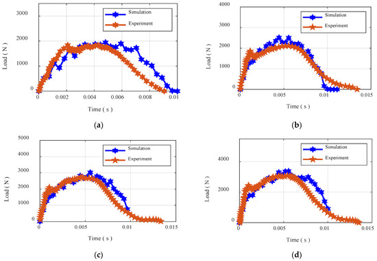 The peak load variation versus time under increasing impact velocities: (a) 1.5 m/s, (b) 2 m/s, (c) 2.5 m/s, and (d) 3 m/s.