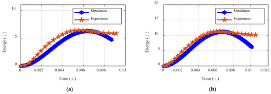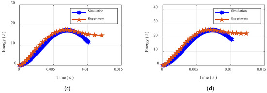 The energy variation versus time under increasing impact velocities: (a) 1.5 m/s, (b) 2 m/s, (c) 2.5 m/s, and (d) 3 m/s.