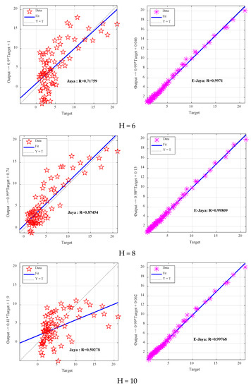 The correlation coefficient, denoted as R, was used to evaluate the level of accuracy of the ANN model. The enhanced ANN model using E-Jaya with eight hidden layer sizes achieves a high level of accuracy, with an R value of 0.998. This is significantly higher than the other hidden layer sizes and the original algorithm.