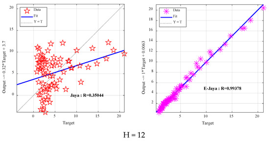 The present study highlights the utilization of a recently developed optimization technique, namely, E-Jaya, to effectively adapt the influenced parameters of artificial neural networks (ANN) during the training process. This study aims to compute the displacement of a composite pipe after low-velocity impacts, and thereby aid in selecting the best design before use. To investigate the efficacy of E-Jaya, it was tested alongside the original algorithm. Both optimization algorithms were subjected to a population size of 1000 and 500 iterations, while the best training was identified through the consideration of different hidden layer sizes (H) (i.e., 6, 8, 10, and 12). The training process for both optimization algorithms is presented in Figure 8.