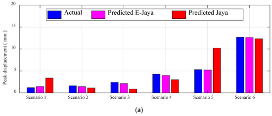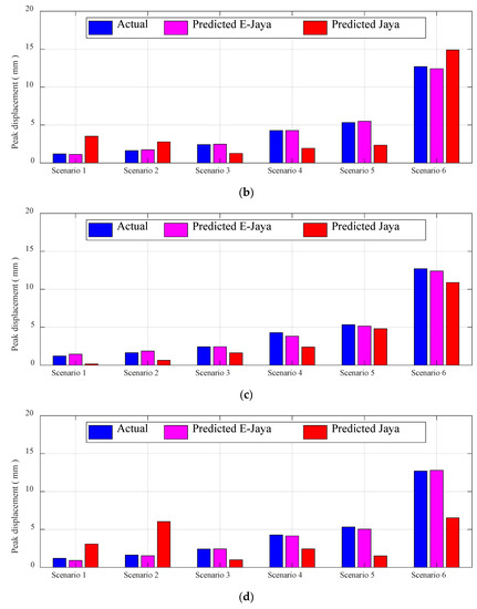Peak displacement prediction for six scenarios: (a) H = 6, (b) H = 8, (c) H = 10, (d) H = 12.