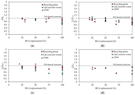 Table 1 presents a list of available studies on the behavior of concrete made with RCA. The RCA replacement percentages in these studies were in the range of 20–100%. The cube compressive strength (fcu) of the base concrete adopted in 67% of these studies was 28–43 MPa, while the remaining 26% of the studies included a base cube concrete strength of 49–54 MPa. One study adopted a base cube compressive strength of 102 MPa. The results of previous studies demonstrating the influence of RCA replacement on the properties of plain concrete are plotted in Figure 1. The y-axis in Figure 1a–d represents the respective normalized slump (S/So), compressive strength (fcu/fcu,o), splitting tensile strength (fsp/fsp,o), and flexural strength (fr/fr,o) of plain RCA–based mixtures relative to that of a benchmark mixture made with NA. Generally, a slump reduction was recorded with an increase in the RCA replacement percentage, independent of the source of the RCA (Figure 1a). In terms of the compressive strength, Figure 1b shows that for RCA from recycling plants, a gradual reduction in compressive strength was recorded with an increasing RCA replacement percentage. An RCA replacement of more than 25 and 50% was detrimental to the compressive strength of concrete made with RCAs and obtained from CDW and laboratory concrete waste, respectively. Figure 1c shows that there was a gradual reduction in the splitting tensile strength with an increase in the RCA replacement percentage for concrete made with RCAs from recycling plants and laboratory waste. The data obtained by Andreu and Miren [] from the CDW category showed, however, no splitting tensile strength reductions for the RCA–based concrete mixtures, possibly because of the high strength of the parent concrete from which the RCAs were obtained (crushed high-strength concrete from a pre-cast factory). Figure 1d shows a reduction in the flexural strength with an increase in the RCA replacement percentage, irrespective of the source of the RCAs used.