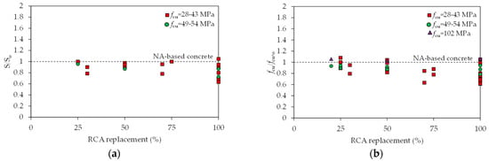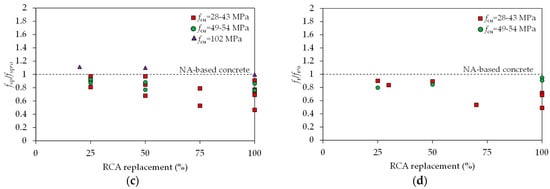 Figure 2 shows the impact of varying the base concrete strength on the properties of concrete made with RCA. The slump reduction for the RCA–based mixtures with different base concrete strengths was insignificantly different (Figure 2a). In contrast, the strength reduction caused by an up to 50% RCA replacement percentage tended to be higher for the mixtures with a base concrete strength of 49–54 MPa than for those with a base strength of 28–43 MPa (Figure 2b,c). The mixtures with a base concrete strength of 102 MPa exhibited no strength reduction due to the use of RCA from crushed high-strength concrete []. At 100% RCA, mixtures with a lower base concrete strength of 28–43 MPa tended to exhibit greater strength reductions than those of the mixtures with a higher base concrete strength of 49–54 MPa. Such a variation in the trend could be attributed to the source of RCA and the inadequacy of the available data to draw meaningful conclusions.