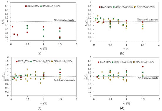 Non-metallic fibers have the potential to offset the probable degradation in the properties of concrete caused by RCA. Table 2 lists the data of available studies carried out to examine the mechanical properties of RCA–based concrete reinforced with non-metallic fibers. Figure 3 demonstrates the influence of non-metallic fibers on the properties of RCA–based concrete tested in previous studies. The y-axis in Figure 3a–d represents the respective normalized slump (Sf/So), compressive strength (fcu,f/fcu,o), splitting tensile strength (fsp,f/fsp,o), and flexural strength (fr,f/fr,o) of RCA–based mixtures reinforced with non-metallic fibers relative to that of the benchmark plain mixture made with NA. It is evident from Figure 3a that the addition of non-metallic fibers had a negative impact on the concrete workability, irrespective of the RCA replacement percentage. The RCA replacement percentage did not have a noticeable impact on the slump reduction caused by the fibers. Contrarily, the detrimental effect of the addition of fibers on the slump tended to be more pronounced with an increase in the fiber volume fraction. Figure 3b shows that the compressive strength of the fiber-reinforced concrete mixtures with an RCA replacement percentage ≤ 25% was almost the same as that of the NA-based plain mixture. Increasing the value of νf did not increase the ratio of fcu,f/fcu,o. For the mixtures with 25% < RCA ≤ 50%, the addition of non-metallic fibers up to a νf of 0.75% was effective in restoring the original compressive strength of NA-based concrete. A further increase in the fiber volume fraction resulted in a decay in the compressive strength. In fact, the ratio of fcu,f/fcu,o for these mixtures with νf > 0.75% was consistently less than unity. The concrete mixtures with 50% < RCA ≤ 100% exhibited a trend similar to that of the mixtures with 25% < RCA ≤ 50. Figure 3c shows that the inclusion of non-metallic fibers at νf > 0.25% was effective in restoring the original splitting tensile strength of the NA-based mixture for the groups with RCA ≤ 25% and 25% < RCA ≤ 50%. For mixtures of these two groups, the ratio of fsp,f/fsp,o tended to increase with an increase in νf. The mixtures with 50% < RCA ≤ 100% exhibited a different trend, where 45% of the data reported that the addition of non-metallic fibers helped in restoring the original splitting tensile strength of the NA-based mixture, while 55% of data demonstrated the ineffectiveness of the fibers in restoring the original splitting tensile strength of the NA-based mixture. Figure 3d shows that the value of fr,f/fr,o was ≥1 for all mixtures with RCA ≤ 25%, indicating an effective restoration of the original flexural strength. The value of fr,f/fr,o further increased with an increase in νf. Although the original flexural strength of the NA-based mixture for the specimens with 25% < RCA ≤ 50% was fully restored due to the addition of fibers, increasing νf had no effect on the flexural strength gain, where fr,f/fr,o remained constantly close to unity. The effectiveness of non-metallic fibers in restoring the original flexural strength of the NA-based mixture for the specimens with 50% < RCA ≤ 100% was uncertain; this is because 40% of the test data for the mixtures of this group had a fr,f/fr,o ≥ 1, confirming the full restoration of the original strength, while the remaining 60% had a fr,f/fr,o < 1, indicating no or the partial restoration of the original strength.