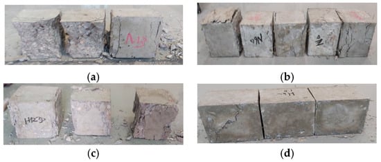 Sample concrete cubes after compression tests: (a) N-R60-NF-0.0; (b) N-R60-HB-1.0; (c) H-R30-NF-0.0; (d) H-R30-HB-1.0.