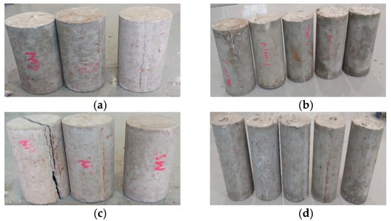 Sample concrete cylinders after splitting tensile test: (a) N-R60-NF-0.0; (b) N-R60-HB-1.0; (c) H-R60-NF-0.0; (d) H-R30-HB-1.5.