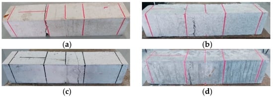 Sample concrete prisms after the flexural test: (a) N-R100-NF-0.0; (b) N-R100-HB-1.0; (c) H-R60-NF-0.0; (d) H-R60-HB-1.5.