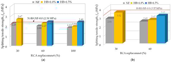 - The use of hybrid BFs at νf = 1.0% was sufficient to fully restore the original splitting tensile strength of the NSC with 30 and 60% RCA. At 100% RCA, it was necessary to use hybrid BFs at νf = 1.5% to restore the original splitting tensile strength. For HSC made with 30% RCA, the addition of hybrid BFs at νf = 1.0% restored the original splitting tensile strength. For HSC made with 60% RCA, only 75 and 88% of the original splitting tensile strength could be restored when hybrid BFs were used at a νf of 1.0 and 1.5%, respectively.