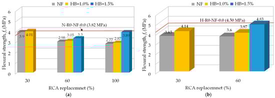- The use of hybrid BFs at νf = 1.0% could not fully restore the original flexural strength of the NSC and HSC with 60% RCA. It was necessary to use hybrid BFs at νf = 1.5% in NSC made with 100% RCA and HSC made with 60% RCA in order to fully restore the original flexural strength of the corresponding NA-based mixture.