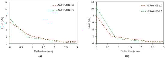 The results of the flexural strength (fr) of the NSC and HSC specimens are shown in Figure 11, whereas the corresponding values are listed in Table 7. Figure 11 is important because it provides information on the effectiveness of non-metallic fibers improving the fr of RCA–based concrete and the possibility of restoring the original fr of the NA-based benchmark specimens. The fr value of NSC made with 30% RCA did not decrease. However, reductions of 22 and 27% were recorded in the fr values of NSC made with 60 and 100% RCA, respectively. The fr values of HSC made with 30 and 60% RCA decreased by 19 and 20%, respectively. The use of hybrid BFs improved the fr values of the NSC and HSC mixtures. At a νf of 1.0%, insignificant improvements of 3, 2, and 4% were recorded in the fr value of NSC made with 30, 60, and 100% RCA, respectively. Furthermore, an increase of 11 and 40% in the fr value was noticed for NSC made with 60 and 100% RCA at νf = 1.5%. The HSC specimens made with 30 and 60% RCA exhibited strength increments of 13 and 10% in the fr values at νf = 1.0%. However, the fr value of HSC made with 60% RCA increased by 34% at νf of 1.5%. It is noteworthy that the plain NSC and HSC specimens failed in a brittle manner at the onset of the initiation of the flexural crack due to the absence of reinforcing fibers, which diminished the tension-stiffening effect. These specimens failed at zero deflection at peak load with null flexural toughness. Such a brittle mode of failure occurs suddenly without warning, which may lead to catastrophic failure in practical setting. The use of hybrid BFs improved the load capacity and post-peak behavior of the NSC and HSC specimens. The typical load-deflection responses of hybrid BF-reinforced NSC and HSC specimens made with 60% RCA are shown in Figure 12. The flexural toughness (T150D) of hybrid BF-reinforced NSC and HSC mixtures is compared in Figure 13. With a hybrid BF value of νf = 1.0%, the flexural toughness values of NSC mixtures made with 30, 60, and 100% RCA were 8.72, 5.83, and 5.97 J, respectively. These results indicate that increasing the RCA replacement percentage from 30 to 60% reduced the flexural toughness of the mixtures made with hybrid BFs (νf = 1%) by 33%. A further increase in the RCA replacement percentage did not result in an additional reduction in the flexural toughness. Increasing the hybrid BF volume fraction from 1 to 1.5% improved the flexural toughness of the hybrid BF-reinforced NSC mixtures made with 60 and 100% RCA by 16 and 19%, respectively. The flexural toughness of the HSC mix reinforced with hybrid BFs at νf = 1.0% decreased from 6.87 and 6.39 J (7%) due to the increase in the RCA replacement percentage from 30 to 60%. The addition of hybrid BFs at νf = 1.5% increased the flexural toughness of the HSC mixture made with 60% RCA by 20%, relative to that of its counterpart with a νf of 1.0%.