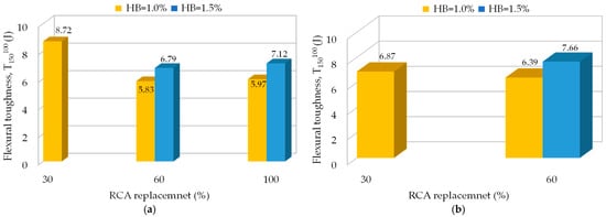 - Increasing the νf of the hybrid BFs from 1 to 1.5% improved the flexural toughness of the NSC with 60 and 100% RCA by 16 and 19%, respectively. The use of hybrid BFs at νf = 1.5% increased the flexural toughness of HSC made with 60% RCA by 20%, relative to that of its counterpart with νf of 1.0%.