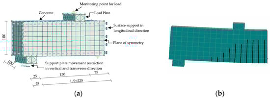 Three-dimensional (3D) simulation models were created using ATENA software [] for concrete prisms tested under four-point bending. Half of the concrete prism was modeled to minimize the computational time. The manual of the software [] recommends using a minimum of four to six elements in the shortest dimension of the member to ensure solution convergence within a reasonable time frame. As such, a maximum mesh size of 15 mm was used, which rendered a total of 833 concrete macro-elements elements and 3332 nodes for the half-model. Steel plates at the load and support points were included in the simulation models to avoid a stress concentration. The bottom plate was prevented from movement in transverse and vertical directions using a line support. The movement of the plane of symmetry was restrained in the longitudinal direction using surface supports. A vertical displacement was induced incrementally at the mid-point of the top steel plate. The load at the mid-point of the top plate and the deflection at the midspan were recorded using monitoring points. The software [] adopts a default multilinear function in compression, which is based on the cylinder compressive strength and Young’s modulus of the concrete. The tension function that was used in the analysis is presented in the following section. Figure 16a shows the geometry and boundary conditions of a typical simulation model, whereas Figure 16b shows a typical deformed shape at peak load.