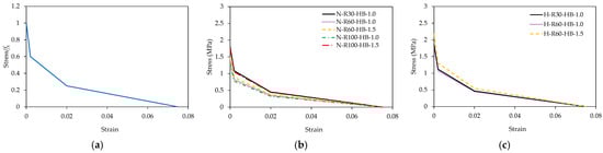 Based on an inverse analysis of the flexural test data, the normalized tension function given by Equation (1) and shown schematically in Figure 17a was developed for the concrete mixtures reinforced with hybrid BFs. The symbols ft, σres, σt, and εt denote the uniaxial tensile strength, residual tensile stress, tensile stress, and tensile strain, respectively. The value of ft was taken as []. Numerous iterations were carried out to determine the breaking points of the tension function. Figure 17b,c shows the respective tension functions of BF-reinforced NSC and HSC.
