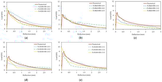 Numerical versus experimental load-deflection responses of NSC: (a) N-R30-HB-1.0; (b) N-R60-HB-1.0; (c) N-R60-HB-1.5; (d) N-R100-HB-1.0; (e) N-R100-HB-1.5.