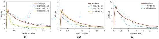 Numerical versus experimental load-deflection responses of HSC: (a) H-R30-HB-1.0; (b) H-R60-HB-1.0; (c) H-R60-HB-1.5.