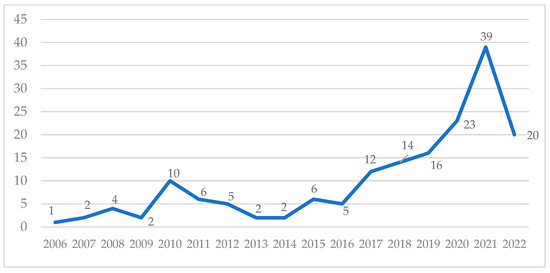 The distribution of publications according to publishing year is provided in Figure 2. It can be observed that the interest of scientists in climate change and its mitigation possibilities by sustainable timber construction was not high until the year 2018 when the number of publications started to increase each year. The highest number of articles (39) was published in 2021.