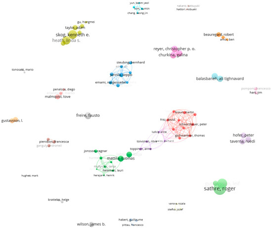 In addition, we conducted analysis on the networks between authors using the VOSViewer tool. A minimum number of 2 and a maximum number of 25 documents were set. Of the 596 authors, 82 met the selected thresholds. For each of the 82 authors, the total strength of the co-authorship links with other authors was calculated (see Figure 3). Each node represents a scholar and the size of the node indicates the total number of citations the scholar has received.