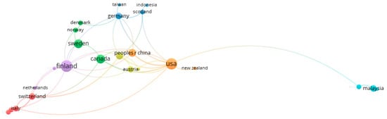 The selected sample of articles was also analyzed in terms of the countries. The VOSViewer tool was used for this purpose. A minimum number of 2 and a maximum number of 25 documents were set. Of the 45 countries, 30 met the selected thresholds. For each of the 30 countries, the total strength of the co-authorship associated with other countries was calculated, and 24 connected countries were distinguished (see Figure 4). Each node represented a country and the size of a node denoted the total number of articles. The analysis revealed that the highest number of publications was published by authors from the USA (25 articles, 1609 citations), Finland (27 articles, 498 citations), Sweden (16 articles, 1021 citations), and Canada (16 articles, 679 citations).