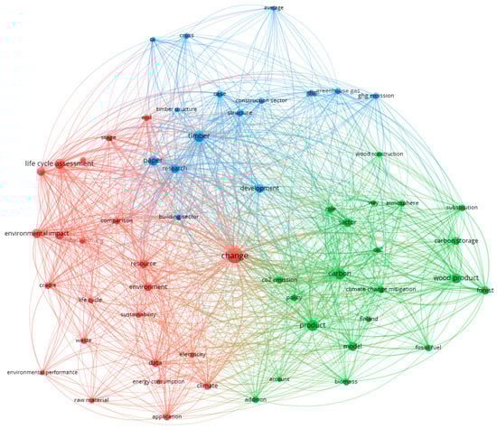 Distinguished keywords were divided into three interconnected clusters. The green-colored cluster includes 21 items, mostly related to climate change mitigations, carbon emissions, wood products, and wood construction. The red-colored cluster with 23 items included life cycle assessment, environmental impact, energy consumption, waste management, and other related items. The blue-colored cluster included 15 items and was mostly related to timber structures and greenhouse gas emissions.