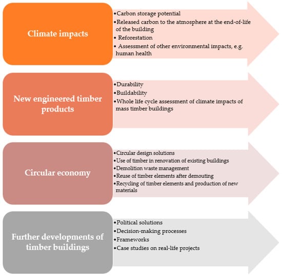Finally, an in-depth content analysis of the selected 169 articles was performed to analyze the potential impacts of timber construction on climate change. Three thematic areas were distinguished: (1) timber as a sustainable material, (2) the carbon storage of and reduction in GHG/CO2 emissions, and (3) the circular economy. After analysis, existing research gaps were identified and future research directions were suggested.