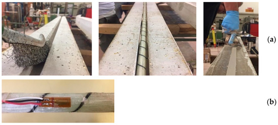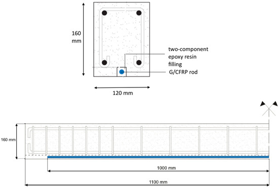 Experimental tests began with the assessment of the RC beam’s behavior with their initial configuration. Subsequently, a strengthening FRP rod was placed according to the NSM technique by creating a 20∙20 mm groove, at the bottom of four RC beam specimens, along their entire length. A total of 2 types of FRP rods were used: a GFRP rod, 9.53 mm in diameter, and a CFRP rod, 9.7 mm in diameter.