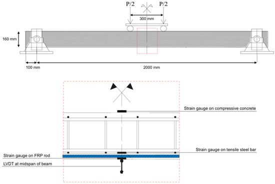 RC beams, with dimensions of 2200 mm in length and cross-section of 120∙160 mm, are reinforced with 4 longitudinal steel bars of 10 mm diameter and stirrups of 6 mm diameter. Stirrups, placed at intervals of 60 mm at the ends and 130 mm at the midspan, were left open at the bottom of RC beams to allow for a groove that was large enough to insert the FRP strengthening and ensure its effectiveness (Figure 1).