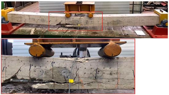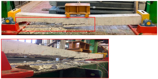 Figure 4 shows the failure mode of specimen B1GFRP for a load value Pf higher than 38.40 kN, which affected the portion of the beam from the midspan section to the end section. It was observed that the failure was caused by the crushing of the compressed concrete and the complete debonding of the GFRP rod, causing the complete detachment of the concrete cover. The B2CFRP specimen also showed a failure due to the crushing of compressed concrete and debonding of the CFRP rod, which started from the section with the maximum moment. In particular, the debonding between the adhesive and the surrounding concrete was recorded at the midspan; moving away from the midspan section, also part of the concrete cover, was affected (Figure 5). In this case, debonding was limited close to the maximum moment region. The maximum load Pf was equal to 49.06 kN.