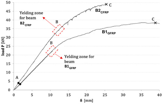 Experimental envelope of load, P, versus midspan deflection, δ, for strengthened RC beams B1GFRP and B2CFRP have been compared in Figure 8. The changes in the slope of the load-deflection curves, resulting from the loading process, of the two strengthened RC beam models, highlight three distinct points, named A, B, and C, corresponding to the first cracking of the concrete, the yield steel strength, and the failure load, respectively. It is observed that the two curves are, therefore, characterized by three distinct parts: an elastic phase from point O to point A (O–A), a cracking phase of concrete (A–B), and the ultimate strength phase (B–C). It can be noted that the strengthening adopted in both cases improves the response of the beam with a higher load value for B2CFRP, although B1GFRP presents a higher ductility.