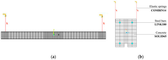 The experimental results were also checked by a comparison of the data obtained by experimentation with the preliminary theoretical one given by FE modeling to limit possible errors of the dynamic response due to the imperfections of the experimental apparatus. The ANSYS code was adopted for FE modeling of the RC beam. The 3D model was created to reproduce the behavior of the undamaged beam considering the presence of all materials, including concrete, longitudinal steel reinforcements, and elastic suspension system or hinge conditions. The typical FE mesh of the undamaged beam B1 is shown in Figure 9a. Concrete was modeled adopting a solid brick element labeled as Solid65 (Figure 9b). Generally, concerning the modeling of steel reinforcement, it is possible to adopt three different strategies, namely the discrete model, the embedded model, and the smeared model. The presence of reinforcements is taken into consideration in the discrete model by using beam elements that are coupled to concrete mesh nodes. By increasing node numbers and degrees of freedom, the embedded model overcomes the concrete mesh constraints. Finally, the smeared model implies that reinforcement is evenly distributed over all concrete elements in a specified region. This approach is particularly useful for large-scale models where the overall response of the structure is not significantly influenced by the presence of reinforcement.