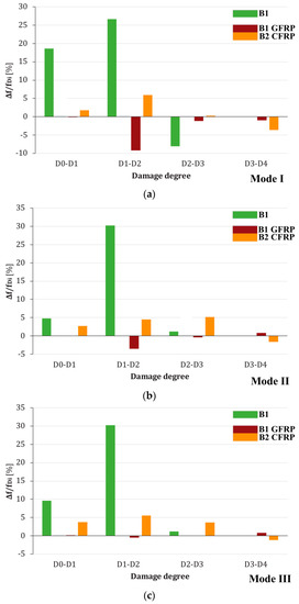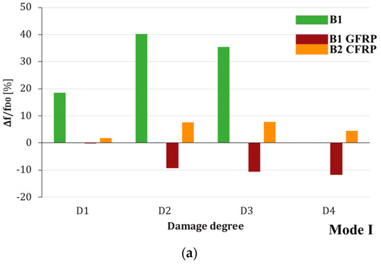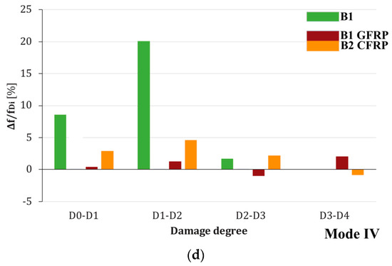 The B1GFRP beam model, however, follows the opposite trend, with a frequency that increases slightly with the load level, as shown in Figure 11b, where the trend of frequency values with the increase in damage state is almost imperceptible, especially for the first two modes. The first three vibration modes are characterized by negative percentage frequency variations compared to the initial state D0*; this trend is due to strengthening with NSM bars in the GFRP rod, limiting cracking damage by bending.