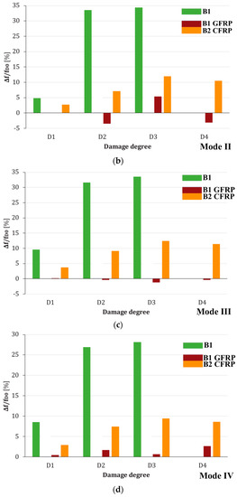 Once the percentage changes in frequency for each damage state have been compared, the comparison of the percentage changes in absolute frequency for the damage state Di in relation to the initial condition D0 (Figure 14) and relative frequency to the damage state Di+1 in relation to the previous damage condition Di (Figure 15) are shown. The aim is to evaluate the incidence of strengthening type in experimental RC beam specimens.