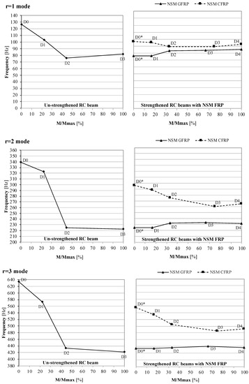 Results of modal testing confirm the effectiveness of the NSM technique for flexural strengthening of damaged RC beams, both with Glass-FRP and Carbon-FRP rods. By analyzing the modal parameters obtained experimentally in terms of frequencies, as shown in Figure 16, it is possible to note a different effect of the two fibers on the dynamic response of damaged beams. For RC beams strengthened with NSM Glass-FRP, frequencies remain stable around the value that occurs for the level of damage prior to strengthening’s application (damage state D3). As the level of damage increases, frequencies remain almost constant with low absolute frequency variations (less than 12%). In the case of the RC beam strengthened with NSM Carbon-FRP, a different behavior can be observed. Frequency values recorded after the application of the CFRP rod (damage state D0*) are higher than the ones obtained before the strengthening application (damage state D3). These values, although undergoing a decrease as the applied load increases, are always kept lower than the values recorded in the pre-strengthening condition.