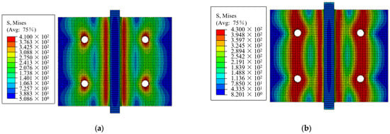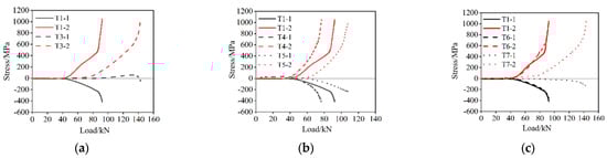 - As shown in Figure 15b,e, without stiffener ribs, the transverse spacing ratio e2/e1 increased from 0.57 to 1.75, and the difference in bolt axial force, bending moment, bending moment stress ratio, and prying force did not exceed 5%, which shows that the bolt internal force was unaffected by the transverse spacing ratio without stiffener ribs. After placing the stiffening ribs, the internal force of the bolt of the T-stub part was reduced with the increase of the transverse spacing ratio, which was because of the force diversion caused by the stiffening ribs, resulting in the warpage of the T-stub flange in the direction of the vertical stiffening ribs. The bending stress ratio of the FE series specimens was 53% and the prying force ratio was 23%, whereas the bending stress of the ES series accounts for approximately 39.9–47.3% of the total stress, and the prying force ratio was approximately 5.8–~13.2%. Hence, the stiffening ribs can reduce the bending moment and prying force of the bolts; however, the prying force effect cannot be eliminated in the case of a small transverse distance ratio e2/e1.