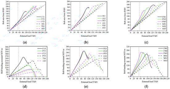 - As shown in Figure 15a,d, with the increase in flange thickness, the flexural stiffness of the flange increased, which reduced the prying of the flange to the bolt. Furthermore, the bolt axial force, bending moment, and prying force gradually decreased. The bolt axial force decreased by 6.1% as flange thickness increased from 12 mm to 16 mm, and the bolt axial force decreased by 6.1%. As thickness increased, the bolt axial force tended to decrease smoothly. The bending moment is influenced by flange thickness, and the bending stress accounted for 27.9% to 52.7% of the total stress without stiffener ribs. After the arrangement of stiffener ribs, it accounted for 19.9% to 44.3% of the total stress, and the bending stress was reduced by approximately 8% compared with the overall.