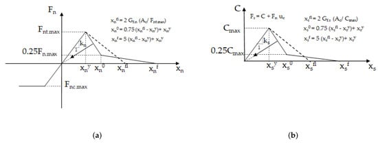 The maximum contact tensile strength, , the maximum cohesive force, , and the maximum contact compressive strength, , are given as functions of the adopted maximum tensile stress, , maximum cohesion stress, , maximum compressive stress, and by the contact area, , according to Expressions (7)–(9):